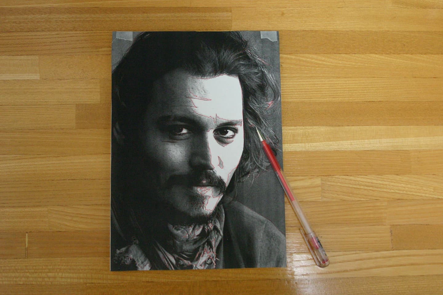 (4)マスキングテープで、白黒コピーをボードに上2カ所とめます。