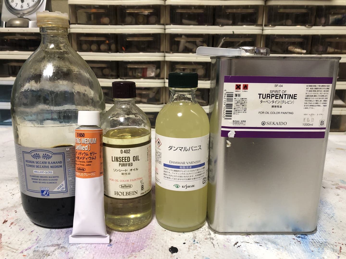 とにかく速く乾かしたい、グレージング(厚塗りの上に、透明色の薄塗り)を多用したい、せっかち派の人は、上の調合で画溶液としても全部いけます。