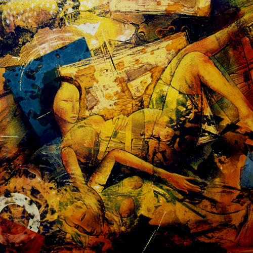 画面全体に拡大コピーをコラージュするように転写し、パネルを平置きニスを全体に流します。